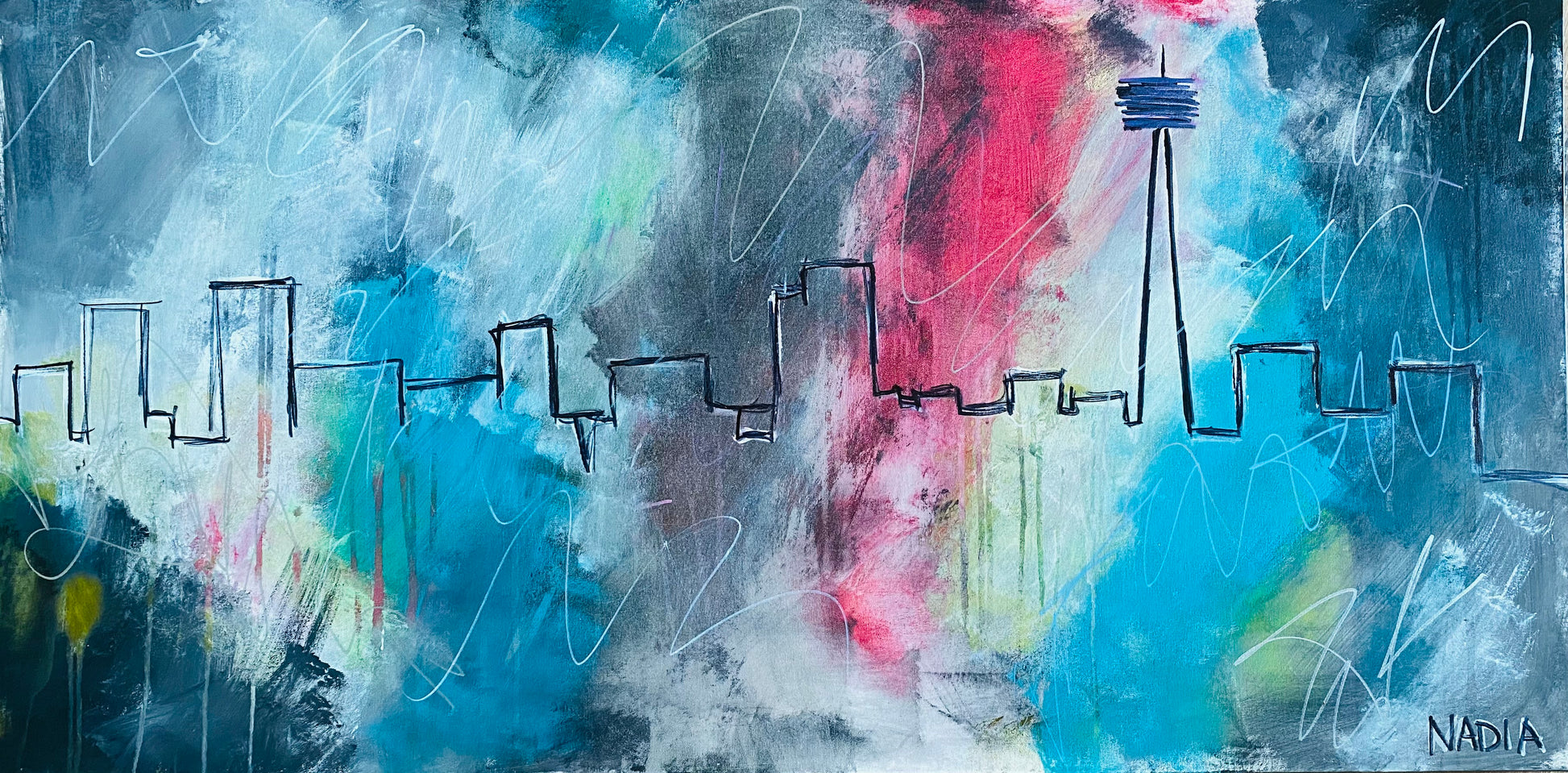 This colourful original Toronto Skyline measures 24" x 48" x 2”.